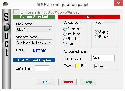 The C:\Program Files\DuctiSOFT\Sduct\Standard indicates the folder that the standards are located in, you can modify this for various clients or to standardize your office by using a shared network drive location.