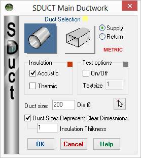If there is a checkmark next to Duct Sizes Represent Clear Dimensions and you are drawing Acoustic (internal) Insulation, the duct size specified will indicate the clear space inside of the insulation, making the duct larger as needed. NOTE: In future releases this option may be moved to the SDCONFIG dialog box.